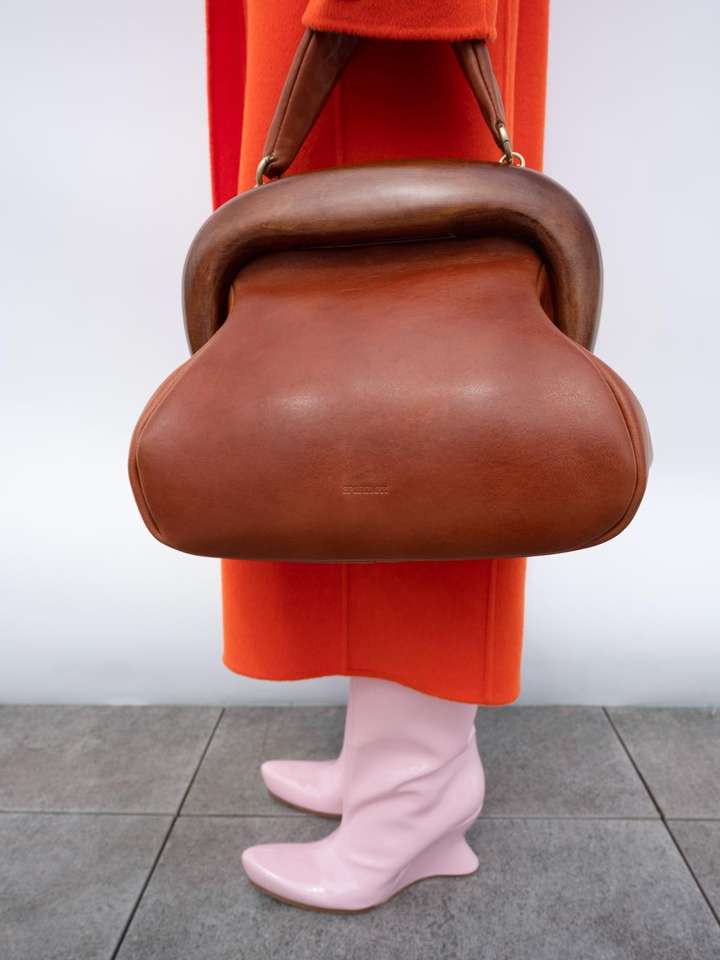 Bouba 系列包袋呈现别具一格的圆润造型,搭配对比鲜明、质地光滑的木质及黄铜提手,外侧饰有金色徽标,缔造令人耳目一新的新鲜设计,彰显前卫风范。既可用作手拿包,亦可用作单肩包。
